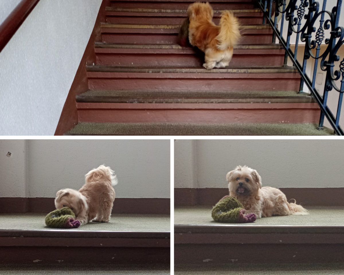 Der Spaziergang endet immer damit, dass Nikita etwas die Treppe hochschleppt. Ich hab heute ihren kleinen Lebkuchenmann vergessen, also müht sie sich mit meiner Mütze ab: